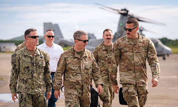 2025年11月24日,在美国海外属地波多黎各,美军参谋长联席会议主席约翰· 丹尼尔·凯恩(前中)访问一处军事基地