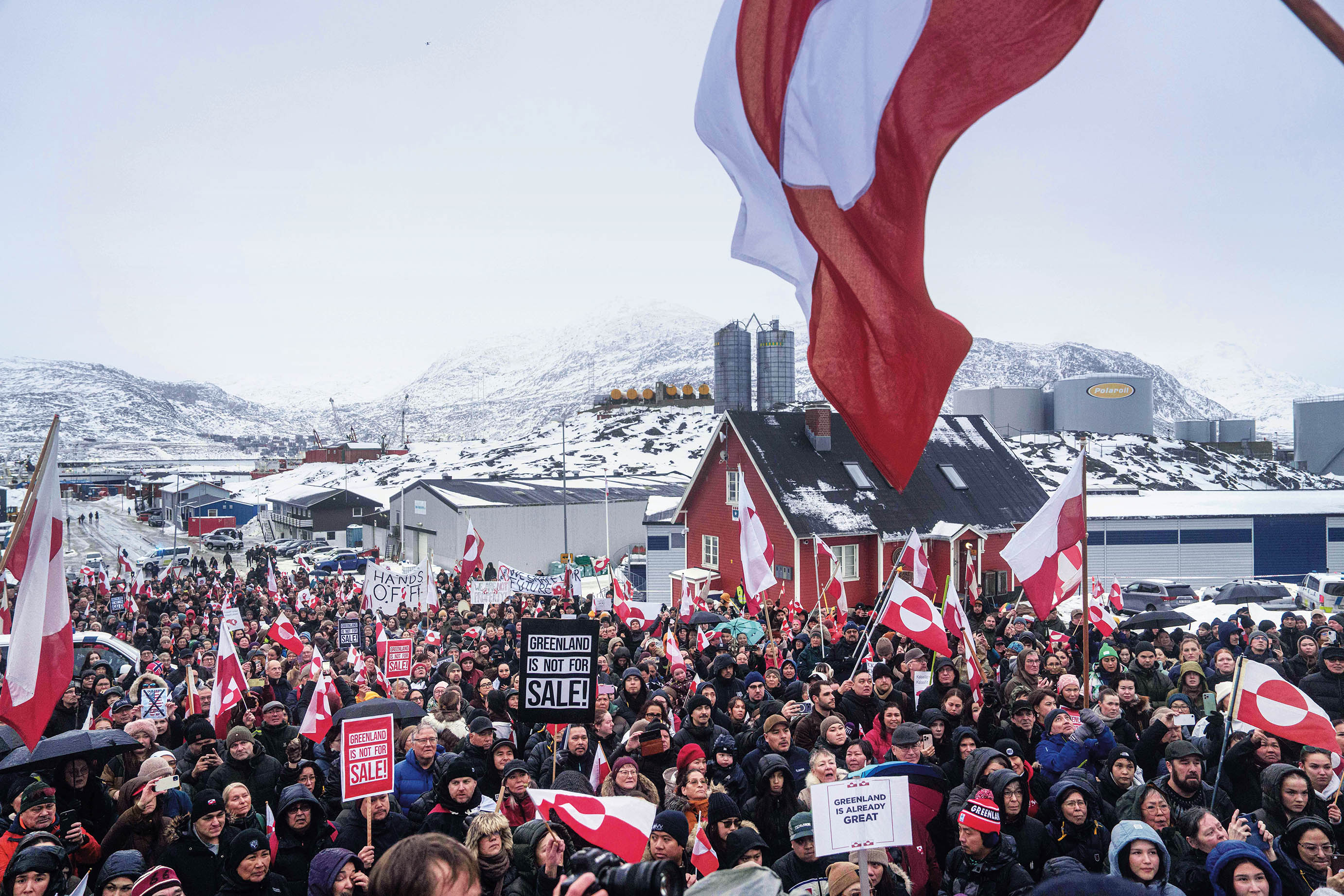 2026年1月17日,在丹麦自治领地格陵兰岛首府努克的美国领事馆前,人们参加示威游行