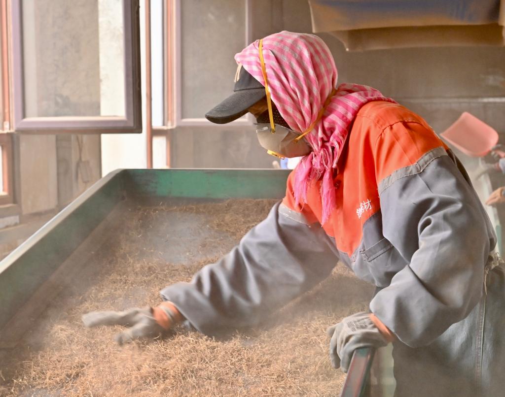 5月14日,在辽宁省抚顺市新宾满族自治县,一名工人在车间内筛选辽细辛。