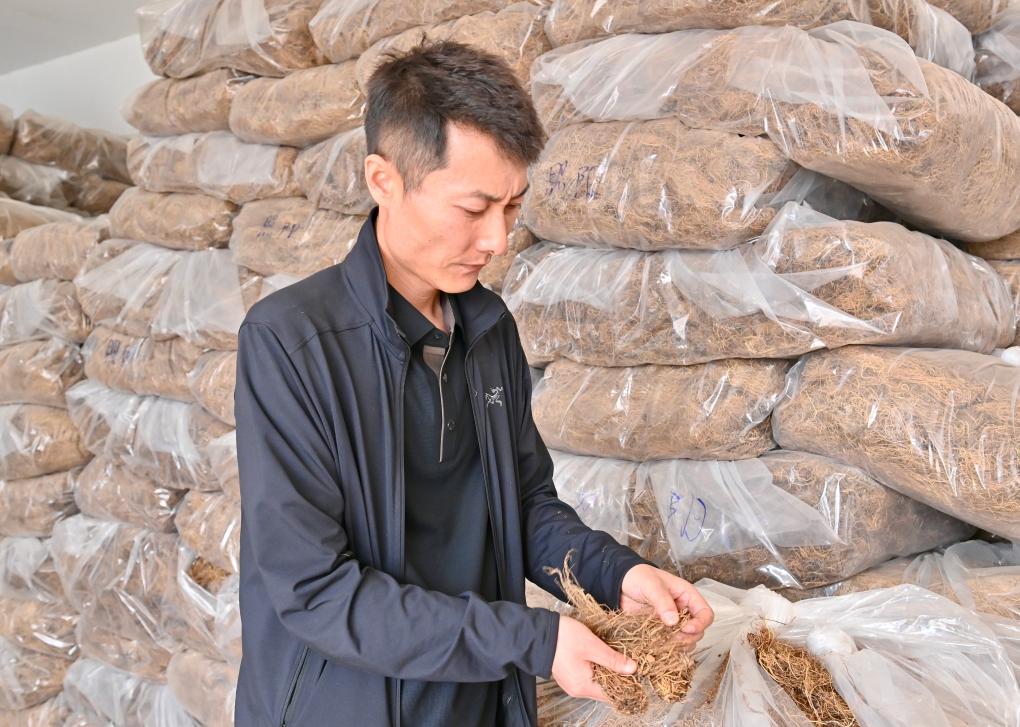 5月14日,在辽宁省抚顺市新宾满族自治县,辰轩中药材经营有限公司负责人在仓库里检查辽细辛品质。