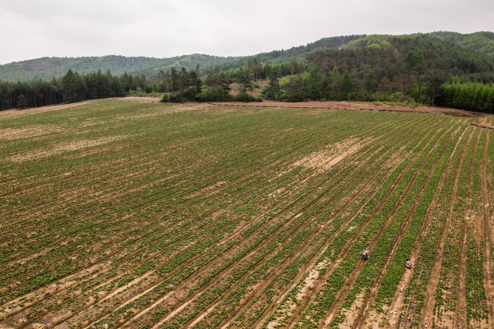 5月14日,在辽宁省抚顺市新宾满族自治县,一家生产辽细辛企业的工作人员在种植基地进行日常维护工作(无人机照片)。