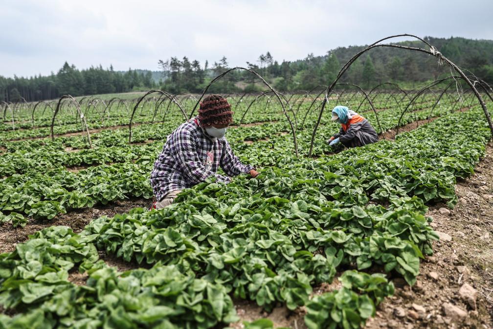 5月14日,在辽宁省抚顺市新宾满族自治县,一家生产辽细辛企业的工作人员在种植基地进行日常维护工作。