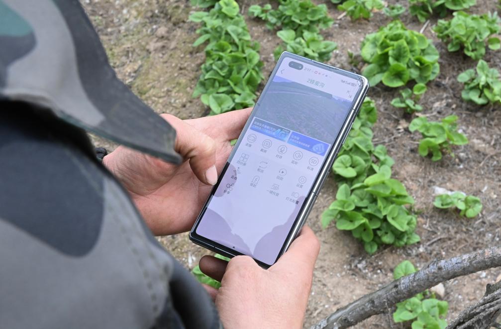 5月14日,在辽宁省抚顺市新宾满族自治县,一名种植户用手机监控查看辽细辛长势。