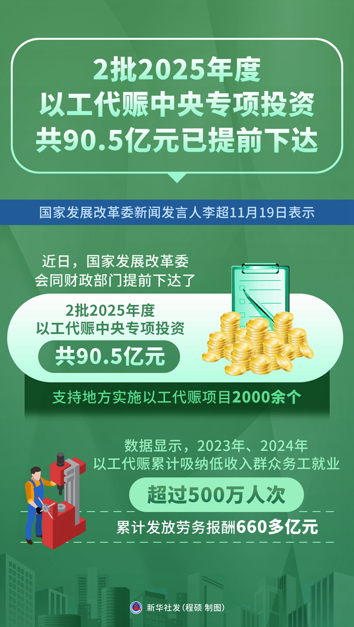 新华社北京11月19日电(记者严赋憬、陈炜伟)国家发展改革委新闻发言人李超19日表示,为充分发挥以工代赈政策作用,近日,国家发展改革委会同财政部门提前下达了2批2025年度以工代赈中央专项投资共90.5亿元,支持地方实施以工代赈项目2000余个。