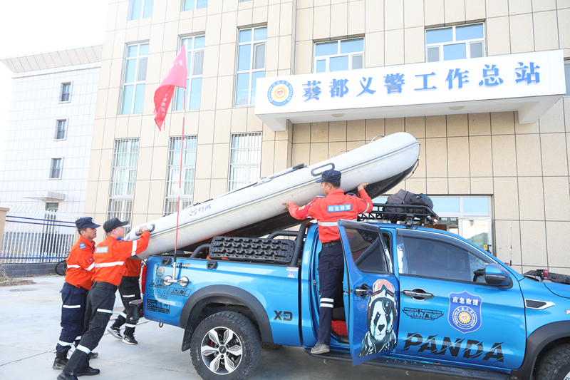 葵都义警救援队队员们正在将水域救援所用装备装车。新华网发 李雨浪 摄