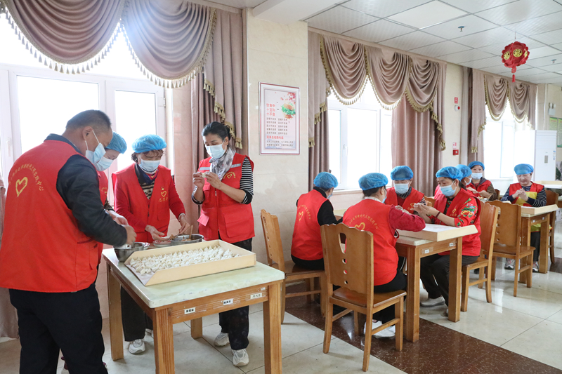 北屯市阳光志愿者协会志愿者们正在养老院为老人们包饺子。新华网发 李雨浪 摄