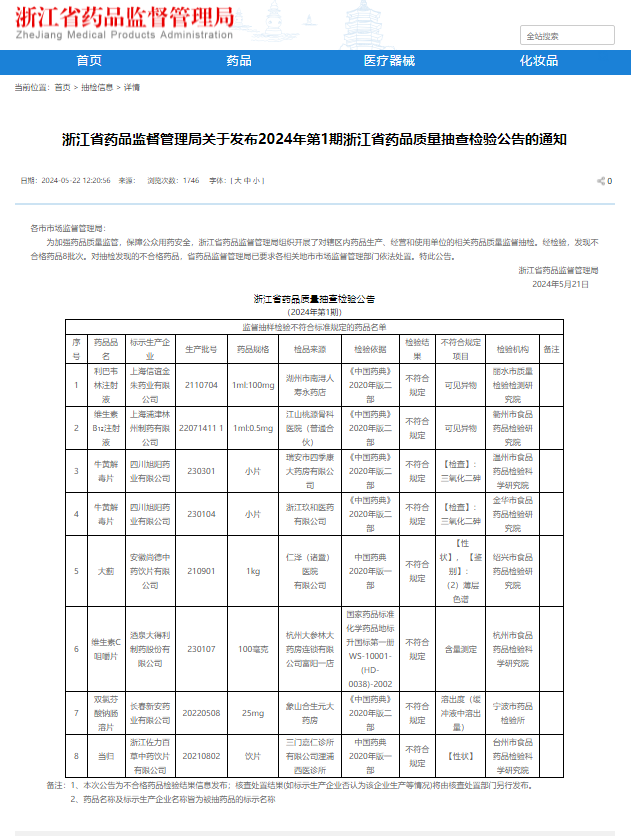 5月22日,浙江省药品监督管理局发布的2024年第1期浙江省药品质量抽查检验公告显示,8批次药品不合格。其中,上海信谊金朱药业的一批次利巴韦林注射液不合格(批号:2110704),检品来源为湖州市南浔人寿永药店,不符合规定的项目为可见异物。
