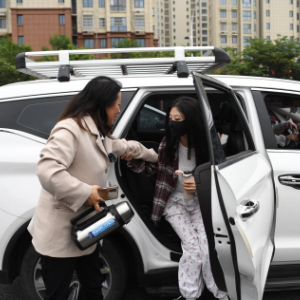 6月7日,在安徽合肥,郁晓楠(右)和妈妈孙如奥乘坐爱心送考车抵达高考考点。