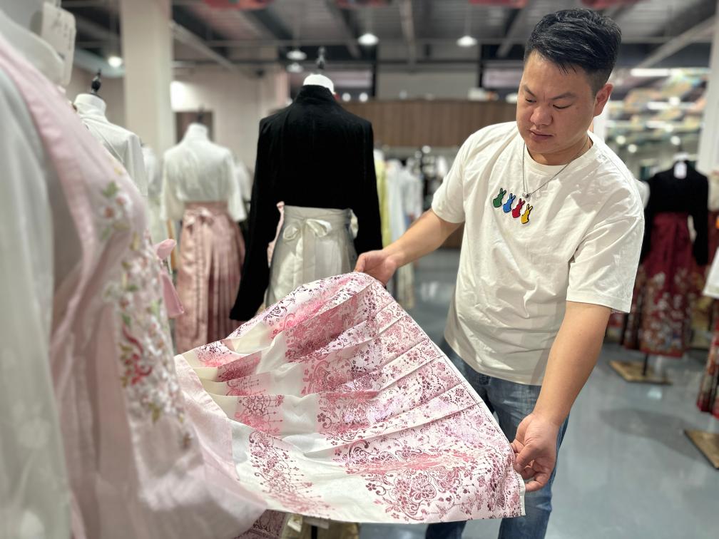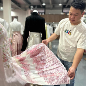 新品上市好不好,消费者的“购买键”不会说谎。在有爱云仓汉服基地的展厅里,一件清新淡雅的长裙吸引了记者的注意。“这也是今夏的新品之一,但一经上市供不应求。”曹县有爱云仓汉服基地负责人李字雷介绍说,这款长裙使用了仿醋酸面料制作,对比传统马面裙,没有褶、更轻薄,垂坠感更强,适合全年龄段的女性消费者日常穿着。汉服爱好者胡馨月说:“我在夏天喜欢穿面料轻薄、浅色的马面裙,这款长裙既清凉还好看。”