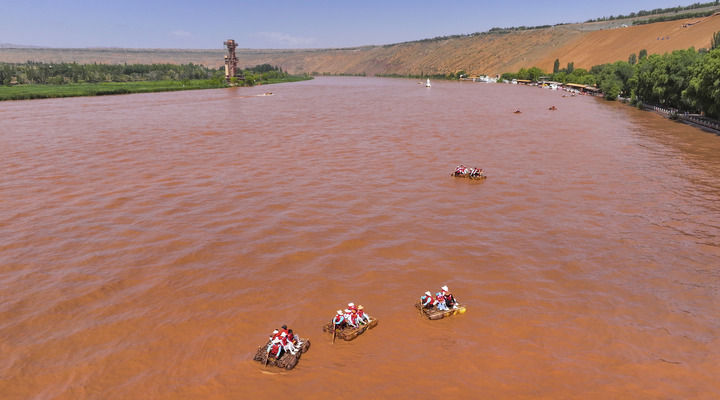 7月5日,游客在流经中卫市沙坡头旅游景区的黄河上体验羊皮筏子。