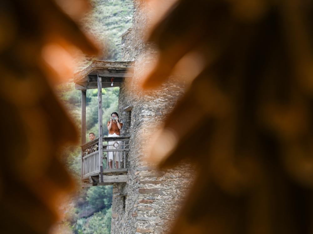 游客在四川省阿坝藏族羌族自治州理县桃坪羌寨的碉楼上拍照。新华社记者 王曦 摄