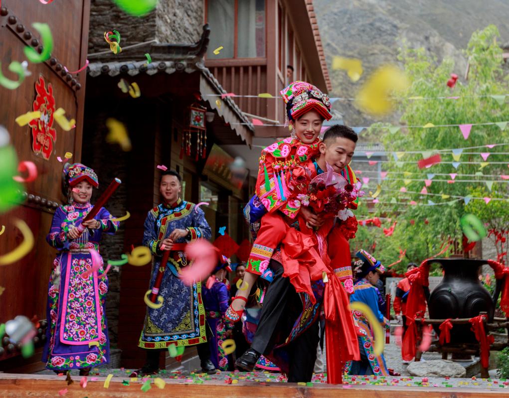 桃坪羌寨举办的一场羌族传统婚礼,新郎背着新娘过门坎。杨文彬 摄