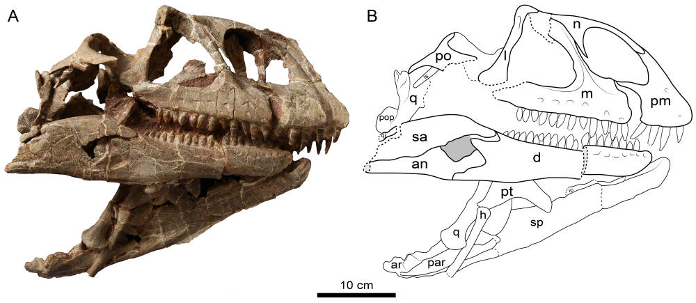 王氏栗树龙的头骨右侧视照片及线条图。(中国科学院古脊椎动物与古人类研究所供图)