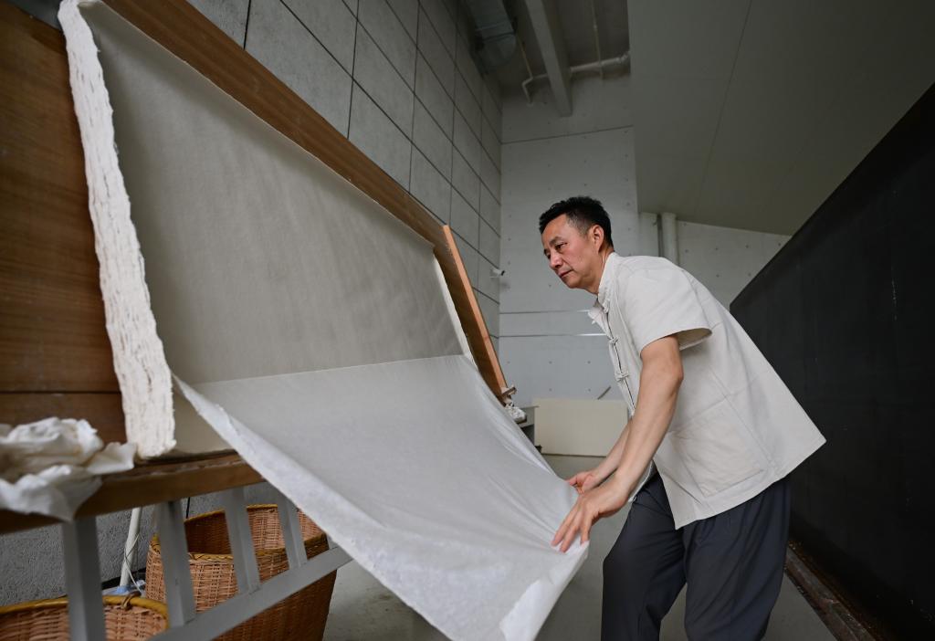 3月6日,在位于泾县中国宣纸小镇的宣纸文化园,工人进行晒纸作业和展示。新华社记者 周牧 摄