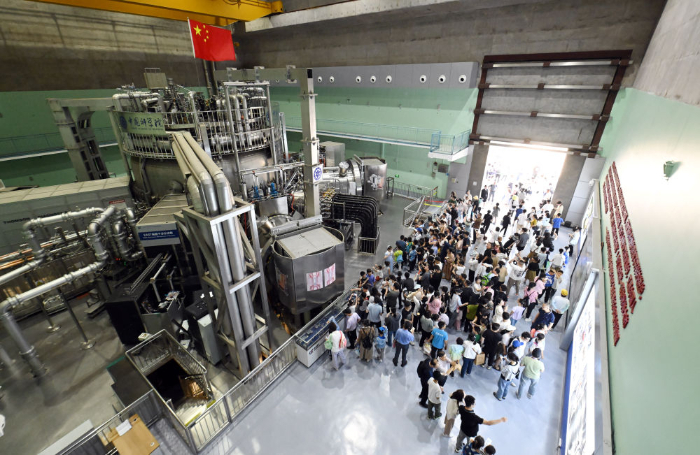 2024年5月18日,在位于安徽省合肥市的中国科学院合肥物质科学研究院等离子体物理研究所,人们参观全超导托卡马克核聚变实验装置(EAST)。新华社记者周牧摄
