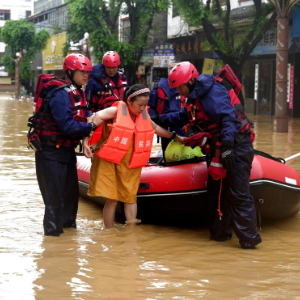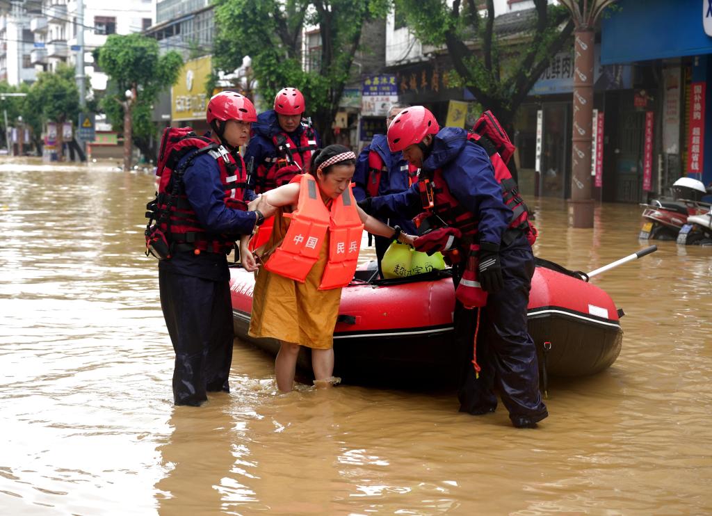 ↑6月24日,救援人员在贵州榕江县城转移群众。