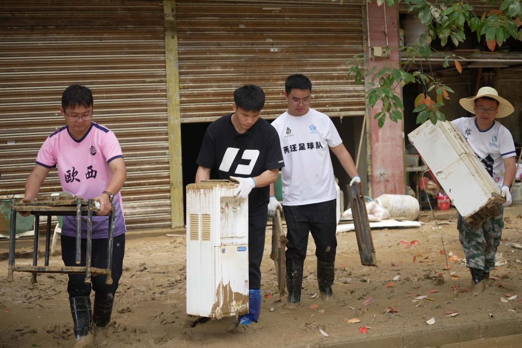 ↑6月26日,林进标(左二)在贵州榕江县城清理受灾物件。