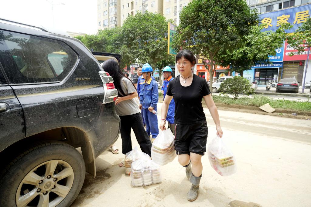 ↑6月26日,在贵州榕江县城,工作人员将盒饭送到抗洪救灾一线。
