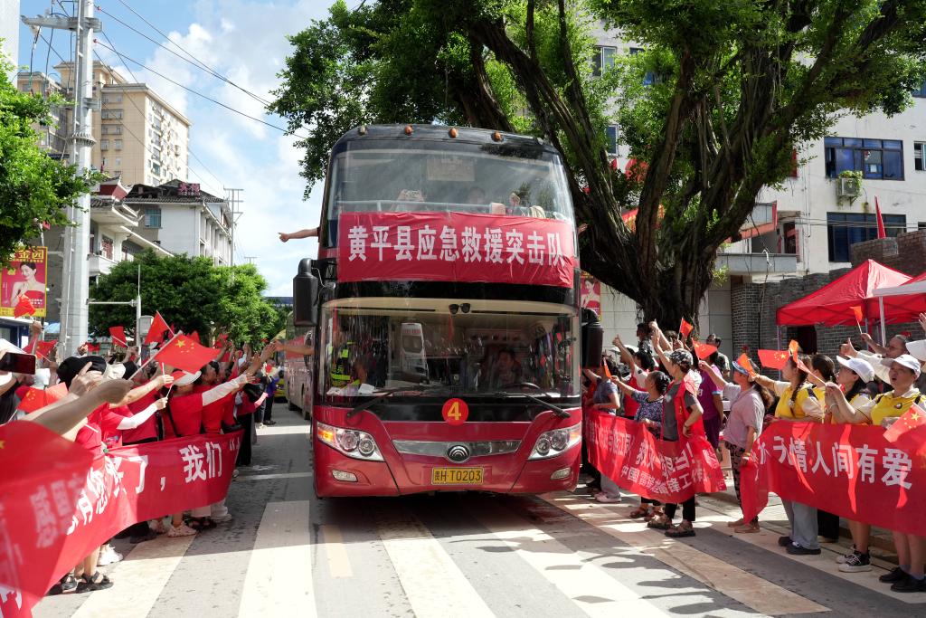 ↑7月3日,在贵州榕江县城,当地居民沿街欢送救援队伍返程。
