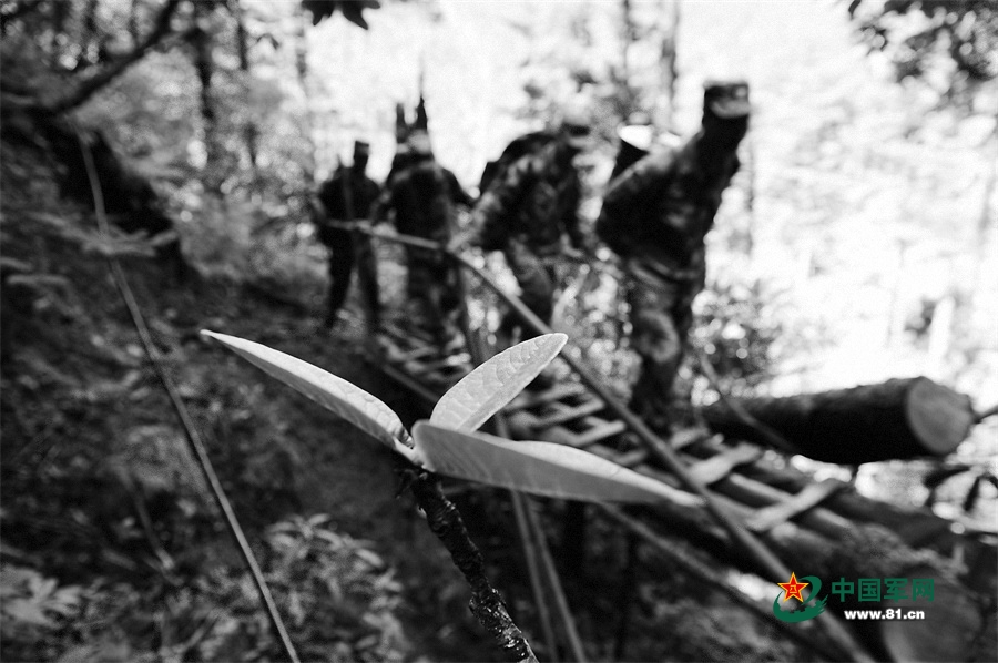 官兵在山路上背运物资。