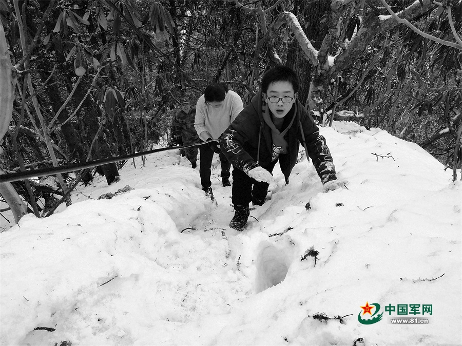 周忠燕和胡博文探访哨所,与官兵一起攀登雪山。