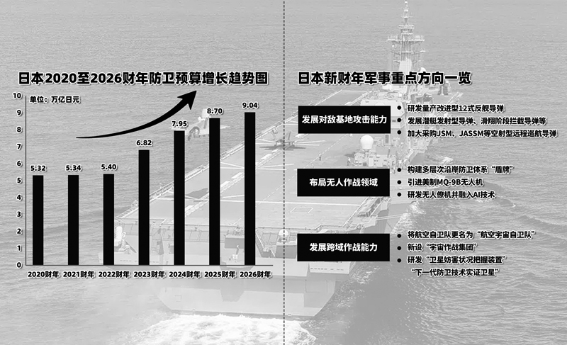 日本2026财年的防卫预算,堪称一份充满扩张野心的激进扩军清单。从发展中远程进攻性武器,到构建跨域作战能力和智能化无人化作战体系,日本在扩张武力的道路上狂飙突进,表现出“以邻为壑”的偏执思维,使其成为亚太和平稳定的重大破坏性因素,国际社会对此应予以高度警惕。(项昊宇 作者系中国国际问题研究院亚太研究所特聘研究员)