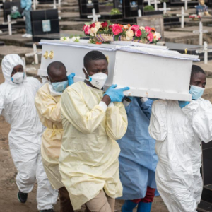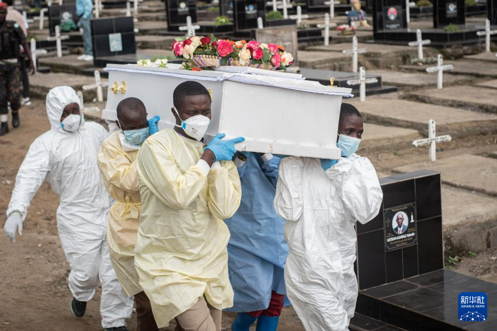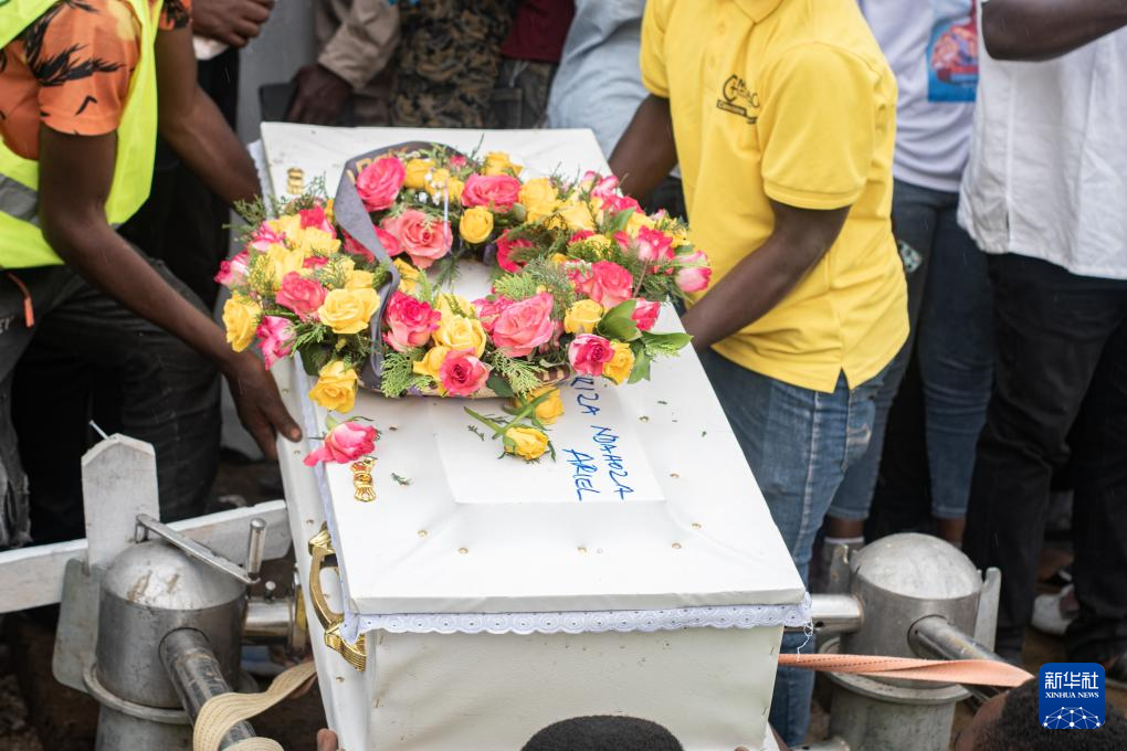 10月10日,在刚果(金)北基伍省首府戈马市,工作人员在基伍湖沉船事故罹难者葬礼上抬棺。