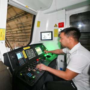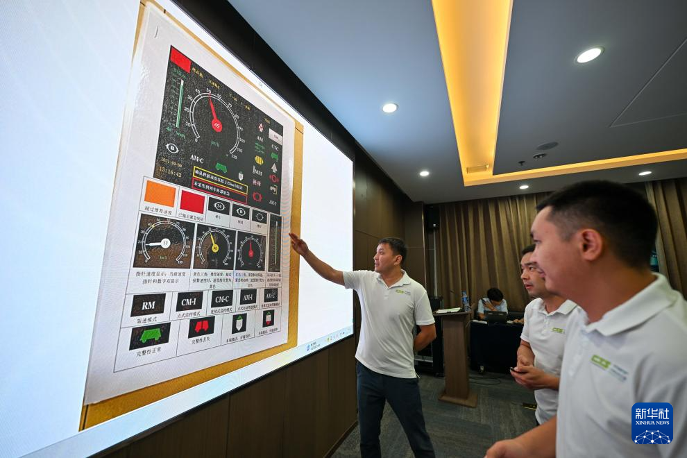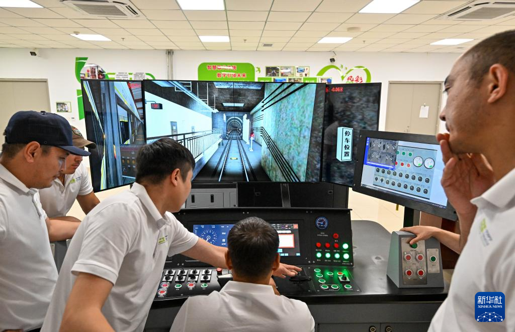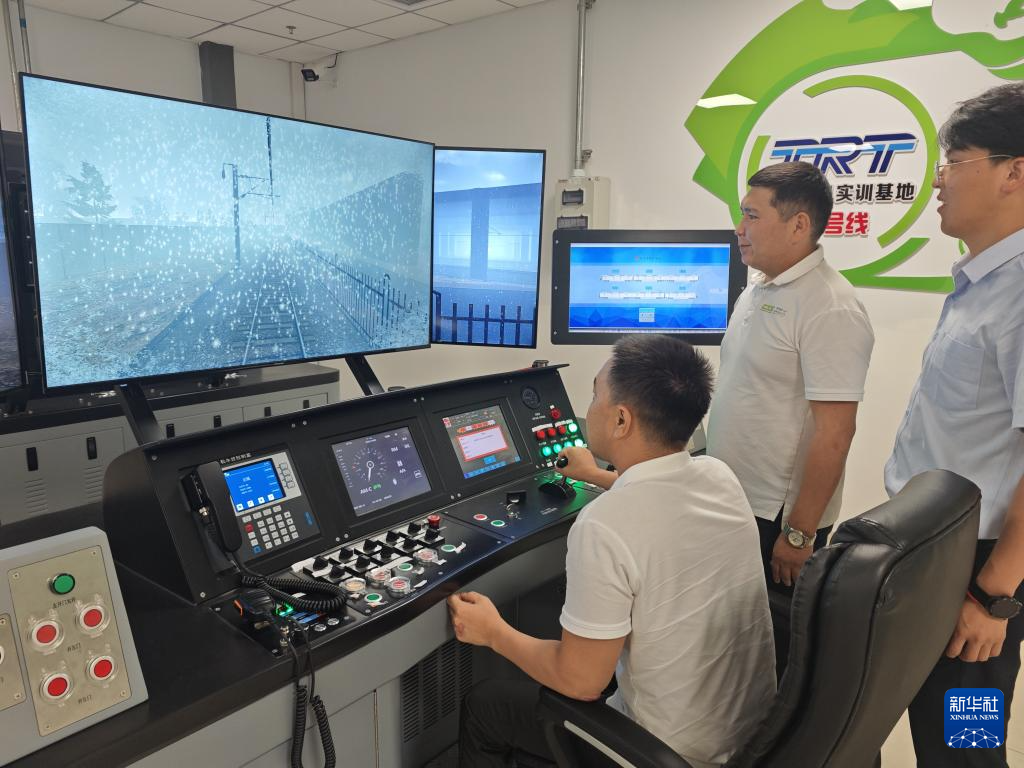 在天津地铁10号线梨园头车辆段,来自哈萨克斯坦的学员在全功能模拟器上进行冰雪天气安全驾驶与应急处置专项训练(8月11日摄)。