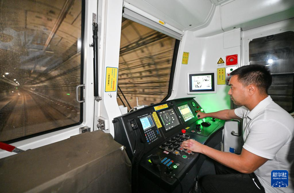 来自哈萨克斯坦的学员达尔罕在夜间驾驶地铁列车在天津地铁10号线上考试(9月5日摄)。
