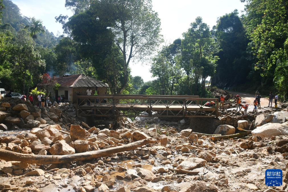 12月13日,在斯里兰卡巴杜勒地区,应急人员抢修受损桥梁。
