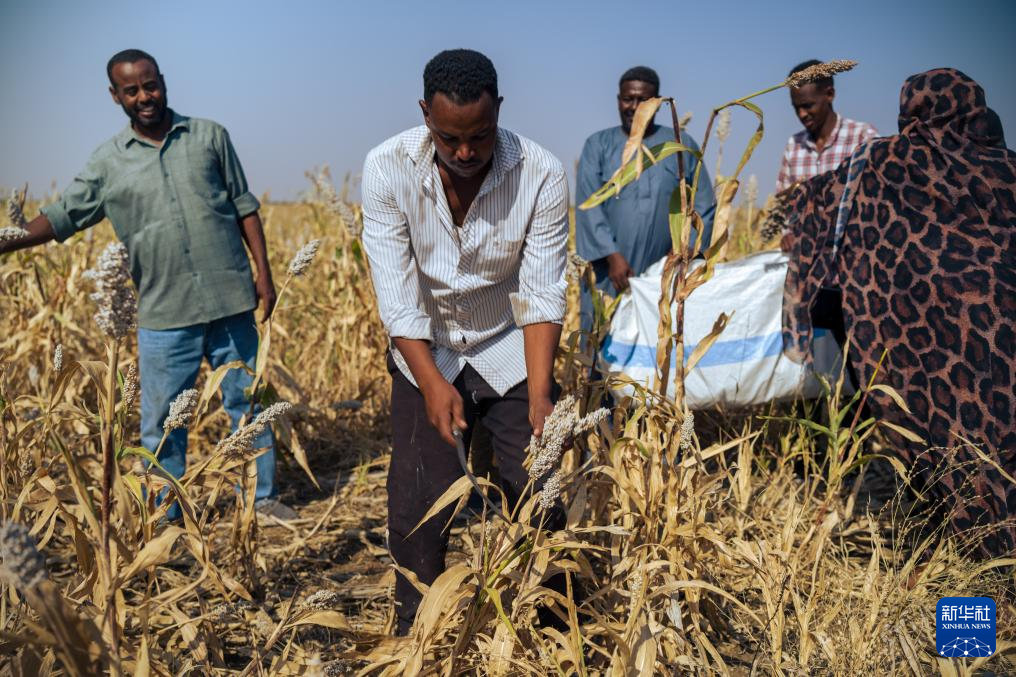 12月12日,在苏丹东部卡萨拉州瓦德希卢地区,农民在田间收获高粱。
