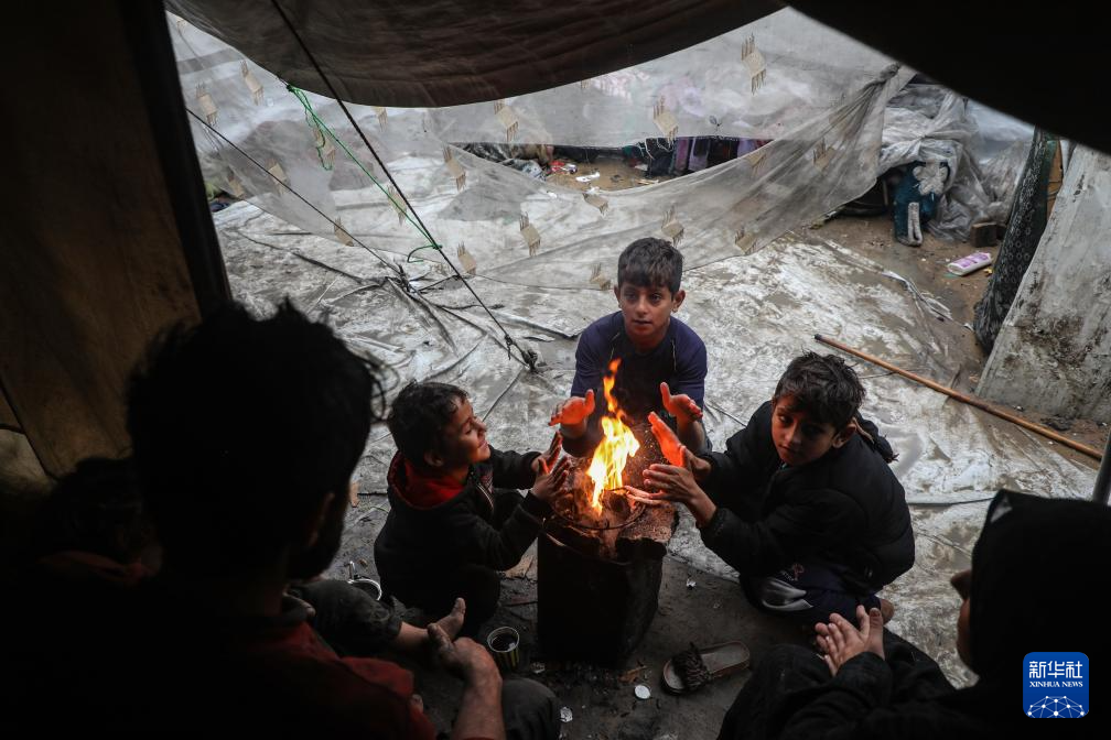 12月12日,几名儿童在加沙城临时栖身的帐篷里点火取暖。