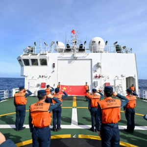 近日,在黄岩岛附近海域执行常态化巡航任务的中国海警黄岩舰执法员举行纪念仪式,为南京大屠杀死难者脱帽默哀。默哀毕,执法员们重温誓词,坚决维护我国海洋权益、捍卫领土主权完整。