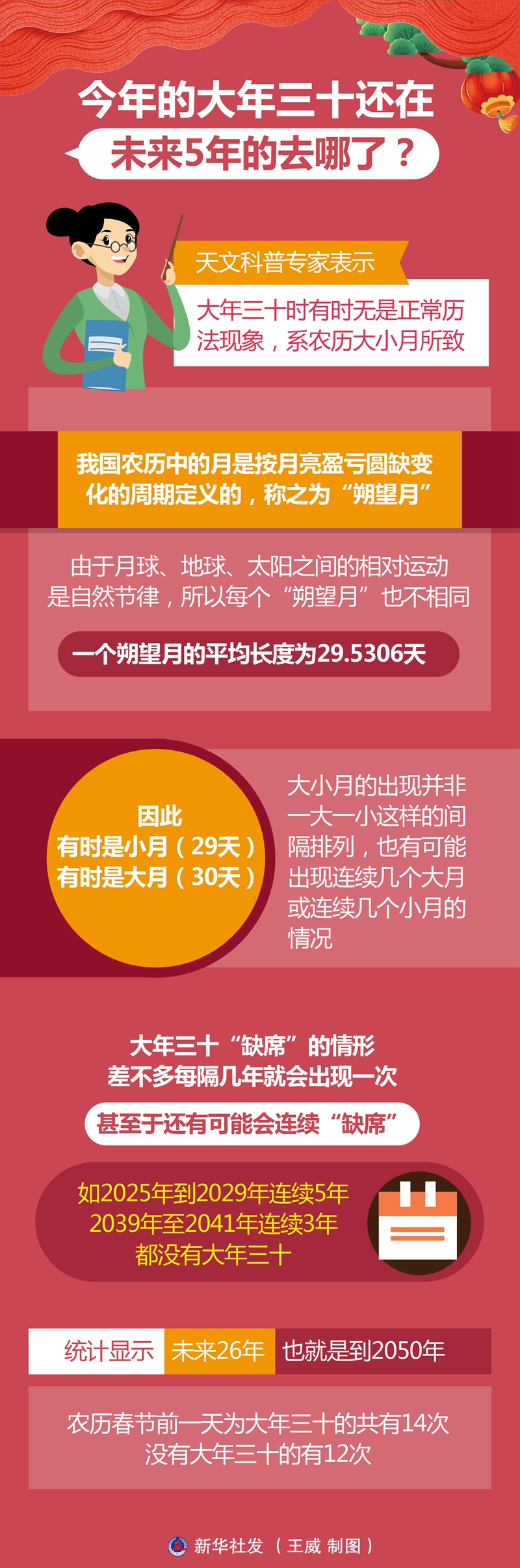 统计显示,未来26年,也就是到2050年,农历春节前一天为大年三十的共有14次,没有大年三十的有12次。