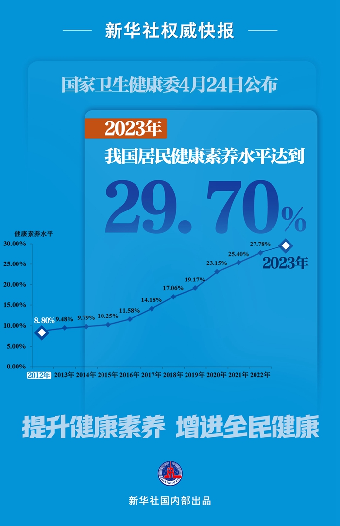 新华社北京4月24日电(记者董瑞丰、李恒)记者24日从国家卫生健康委了解到,2023年我国居民健康素养水平达到29.70%,比2022年提高1.92个百分点,继续呈现稳步提升态势。