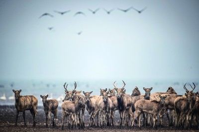 麋鹿在历史上曾广泛分布于我国长江、黄河流域的平原、沼泽地区,但因气候变化和人类的猎杀,在汉朝末年近乎绝种,20世纪初在我国灭绝。1985年,我国与英国合作启动了麋鹿重引进项目,分批引进77只麋鹿,通过人工繁育、野化放归等措施,到目前已在历史分布区的6个区域恢复重建野外种群,总数量达6000余只,打造了“世界野生动物保护的中国样板”。