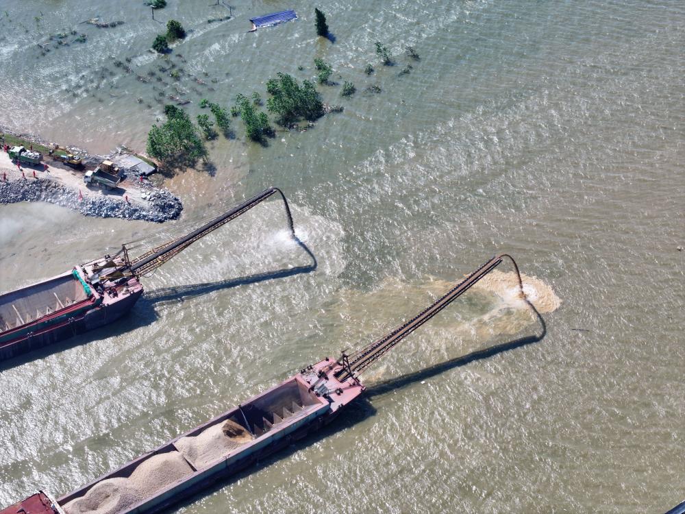 截至8日17时,团洲垸洞庭湖大堤决口封堵长度已达180.5米,剩余45.5米,预计在9日12时前完成封堵。记者在决口现场看到,一辆辆满载块石、砂卵石的卡车依次在决口两侧投放物料,大型挖掘机、推土机进行填埋作业,大型驳船同步开展水上抛投作业。