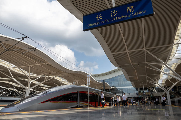 2024年6月15日,武汉至深圳北的G875次列车经停长沙南站。当日,京广高铁武广段复兴号动车组列车按时速350公里高标运营,标志着京广高铁武汉至广州段安全标准示范线全面建成,京广高铁全线实现复兴号动车组列车按时速350公里高标运营。新华社记者 伍志尊 摄