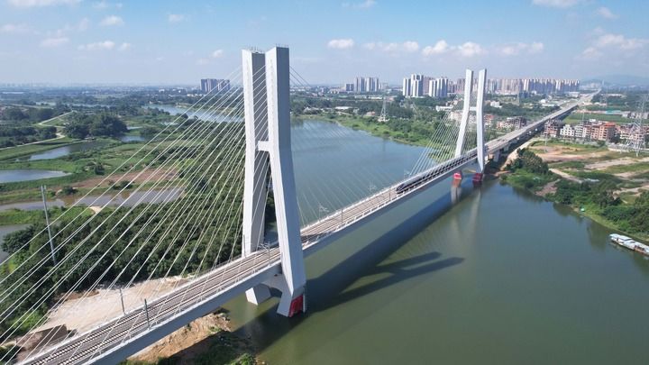 2023年9月26日,广汕高铁正式开通运营,列车经过位于广州市增城区的广汕高铁增江特大桥(无人机照片)。新华社记者 田建川 摄