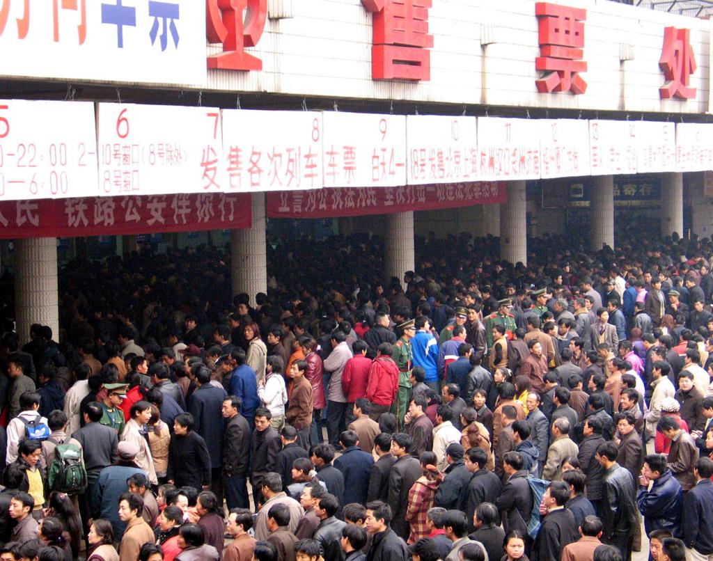 2004年1月28日,重庆火车站的售票处被购票者围得水泄不通。(新华社照片)