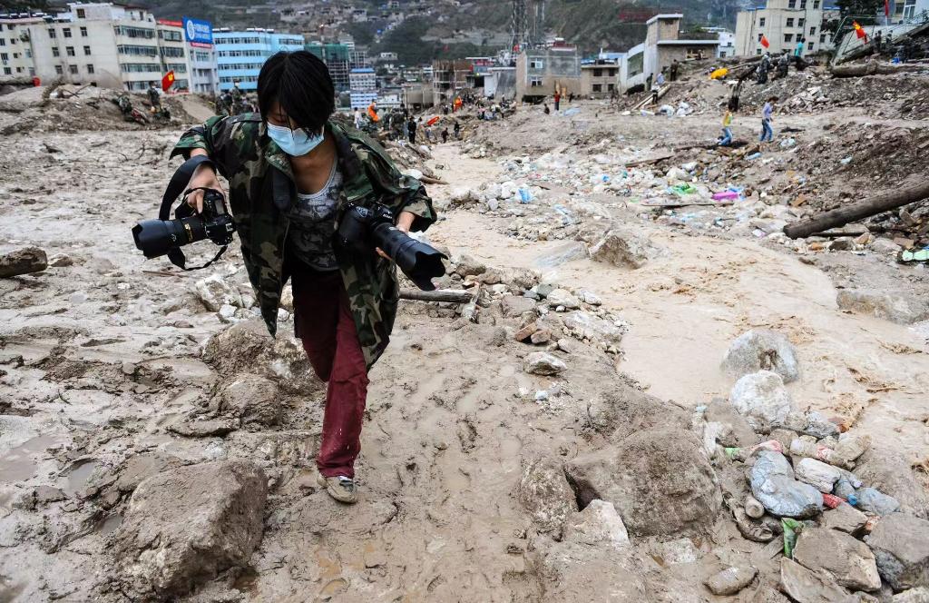 刘潇:“被拍到这张工作照时,距离我入职新华社成为一名摄影记者刚刚45天。2010年舟曲泥石流灾难发生后,陕西分社迅速前往灾区支援报道,在被窝里得知消息的我,第一反应就是向单位申请,能否一同前往灾区。作为一个刚工作的22岁女生,怀着对新闻记者这个职业的热情,赶往重大事件新闻现场,是当时唯一的念头。”