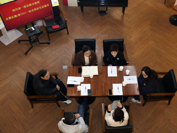 2023年2月17日,上海市长宁区虹桥街道古北市民中心主任盛弘和居民代表讨论社区服务功能的相关议题。新华社记者 刘颖 摄