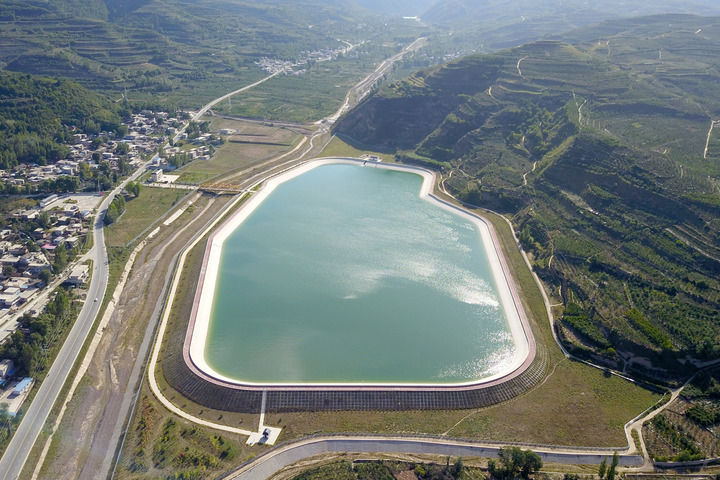 在甘肃省天水市拍摄的引洮供水工程杨家湾调蓄水池(2021年9月8日摄,无人机照片)。新华社记者 范培珅 摄