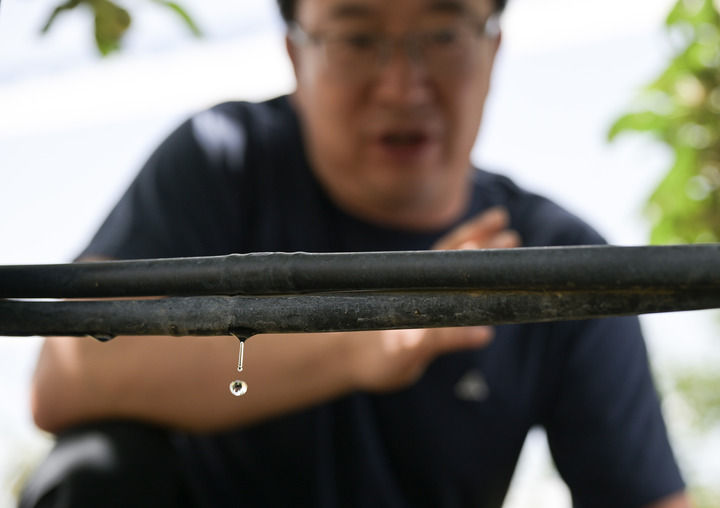 在陕西省延安市洛川县槐柏镇度古村“飞天”苹果基地灌溉示范点,节水滴灌系统为果树灌溉(2024年6月23日摄)。新华社记者 李贺 摄