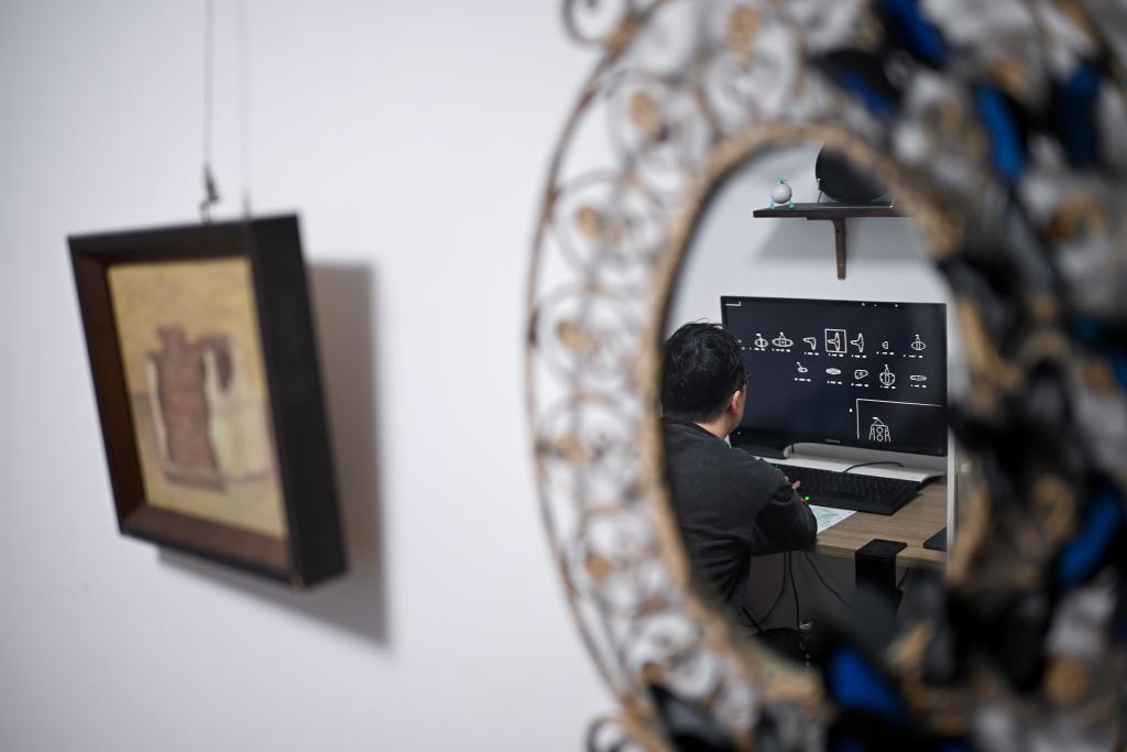 12月13日,在位于深圳市龙岗区大芬油画村的工作室里,陈剑华在画画。