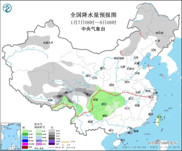 图1 全国降水量预报图(1月6日08时-7日08时)