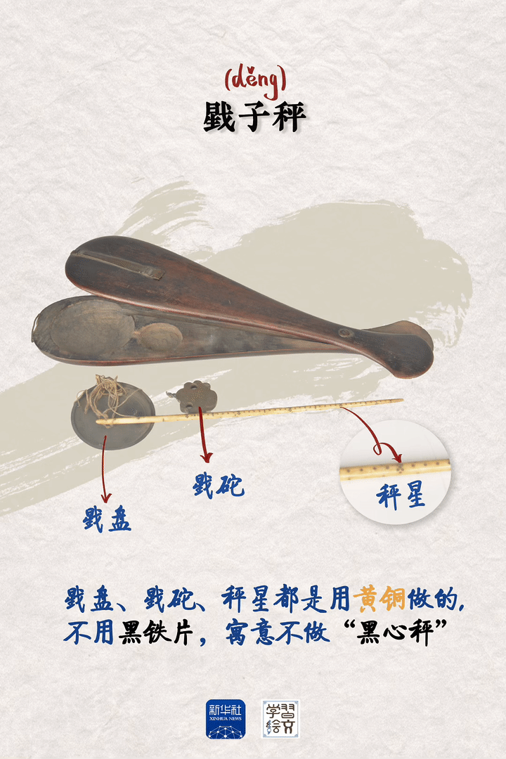 明清时期度量衡一斤为十六两,戥子秤的秤星分别用北斗七星、南斗六星、福禄寿三星为标记,刚好十六颗,意在警诫后人做生意要诚信,称量货物切莫缺斤短两、投机取巧。