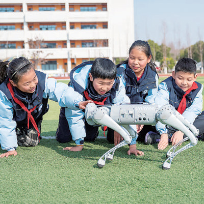 江苏昆山信义小学大课间上,学生们与机器狗互动。张从余 摄