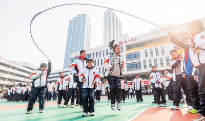 湖北武汉七一华源中学大课间上,学生们在跳绳。薛婷 摄