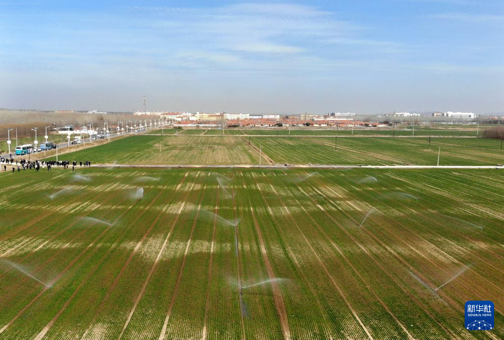 在青岛西海岸新区大场镇一处农田里,地埋式自动伸缩喷灌设备浇灌小麦(3月13日摄,无人机照片)。